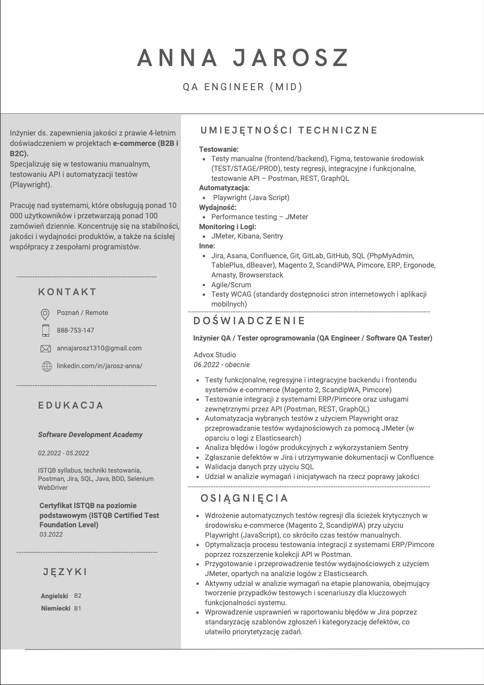 Quality Assurance Engineer with over 4 years’ experience in complex e-commerce projects (B2B/B2C). I specialise in developing test strategies for systems serving over 10,000 users. I am an expert in process automation using Playwright (JS) and JMeter performance testing. I focus on the Shift-Left approach, digital accessibility (WCAG) and quality optimisation through data analysis and AI.